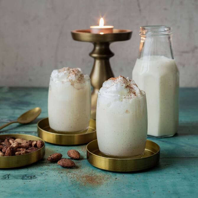 Poista kanelitangot ja vatkaa valkuaiset vaahdoksi juuri ennen tarjoilua. Sekoita noin puolet valkuaisista juoman joukkoon ja jätä osa koristeeksi. Jaa juoma laseihin. Viimeistele annokset valkuaisvaahtonokareella ja ripauksella jauhettua kanelia tai muskottipähkinää.